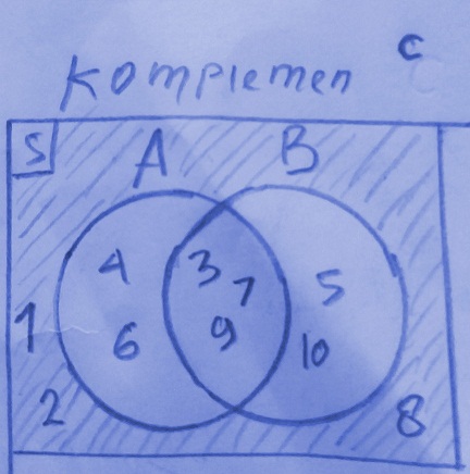 Komplemen adalah semua anggota di luar anggota himpunan yang disebutkan atau dengan kata lain komplemen merupakan anggota yang bukan jawaban dari suatu operasi. Komplemen erat hubungannya dengan semesta. Semesta adalah semua gabungan anggota dari himpunan-himpunan yang ada.